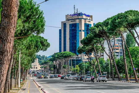 Tirana, Albania - June 21, 2021: Cityscape of Bulevardi Deshmoret e Kombit boulevard with Twin Tower skyscraper and Fibank on the roof. Traffic on the city street of the Albanian capital