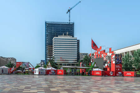 Tirana, Albania - June 21, 2021: Euro 2020 fan zone at Skanderbeg Square in Tirana. Cityscape with new modern skyscrapers in the center of the Albanian capital