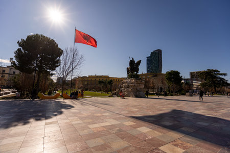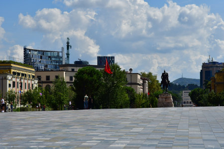 Tirana, Albania- August 10, 2019:Skanderbeg Square and Skanderbeg Monument in Tirana, Albania