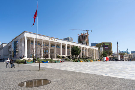Tirana, Albania. March 2023. exterior view of the National Theater of Opera and Ballet in Tirana on Skenderbej square in the city center