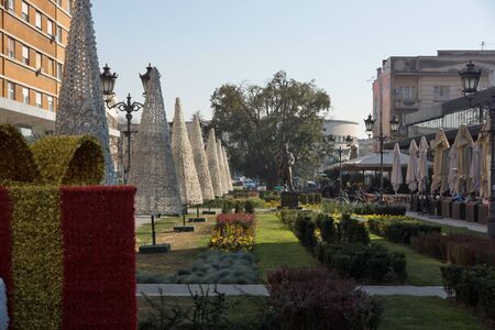 Tirana, Albania. November 26, 2017: Newly reconstructed city central Skanderbeg square, decorated with red and black and raised National Flag for Independence Day celebration.