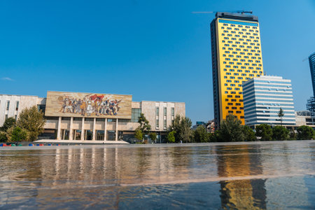 Tirana, Albania- August 10, 2019:National Historical Museum and Skanderbeg Square in Tirana, Albania