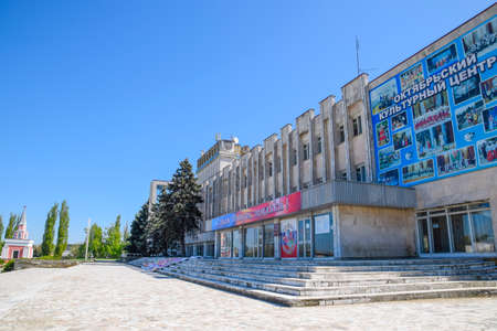 Octyabrsky, Russia - April 24, 2017: House of Culture near the central square. The legacy of Maistrenko. Construction of the Soviet era. Krasnodar Krai, Krasnoarmeisky District.