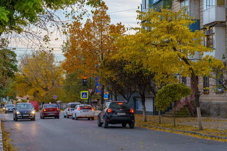 Autumn evening view of a city road with cars. Background with copy space for text. Illustrative editorial. October 21, 2021 Balti Moldova.