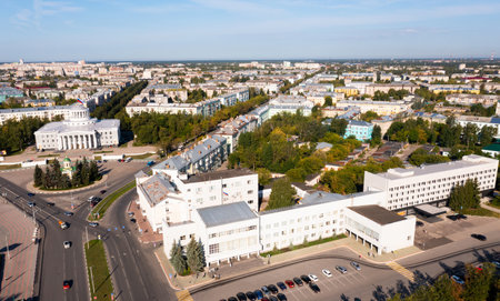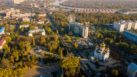 Vladikavkaz, capital of North Ossetia. Panorama of historical downtown from drone flight.