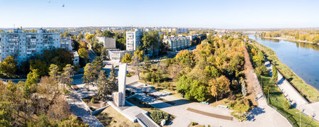 Aerial view of city center of Bendery (Bender; Tighina) on river of Dniester, in unrecognised Pridnestrovian Moldavian Republic (Transnistria; PMR; Trans-Dniester; Bessarabia), officially Moldova