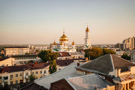Sunset in Voronezh. Aerial view of Voronezh downtown in summer evening.