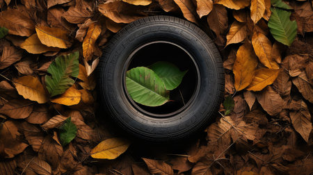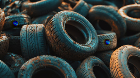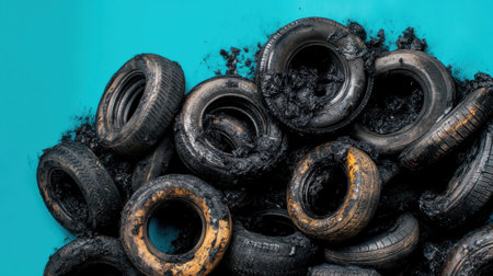 A visually striking image of used tires covered in black tar, highlighting the environmental challenges of waste management and pollution.