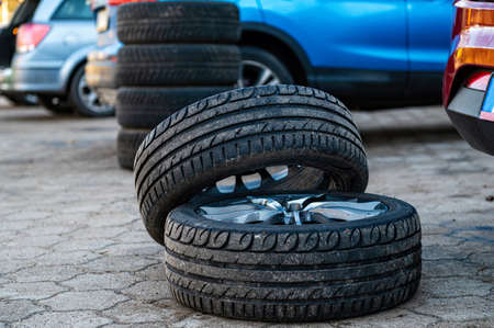 Summer tires on steel rims. Close up of cars tires background.