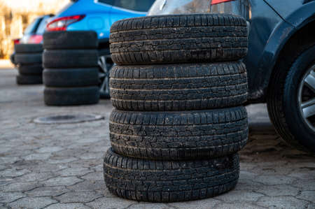 Background of used car tires pile in the tire repair shop yard, Recycle abd reusable ideas. Selective focus, copy space.
