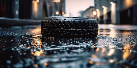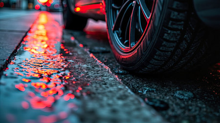 A dramatic nighttime urban scene showcases a car tire's captivating reflection of vibrant city lights in a glistening puddle. The wet asphalt creates a dark, moody atmosphere enhanced by the red and orange bokeh of the illuminated buildings. This close-up photography captures the detail of the tire on the street, making it ideal for projects emphasizing automotive design, urban environments, or a sleek, cinematic aesthetic. Explore themes of night, rain, and reflection through this captivating image.