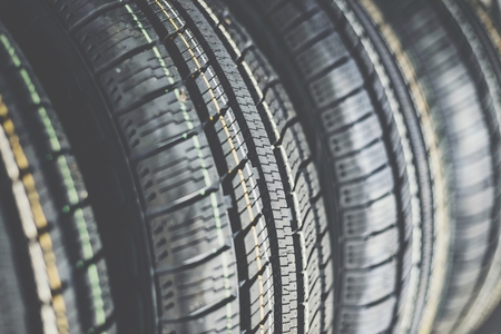 new car summer tires in a row. Car tire tread close-up.