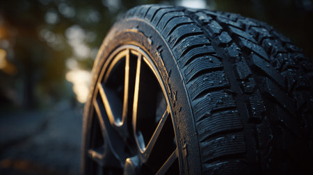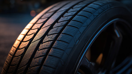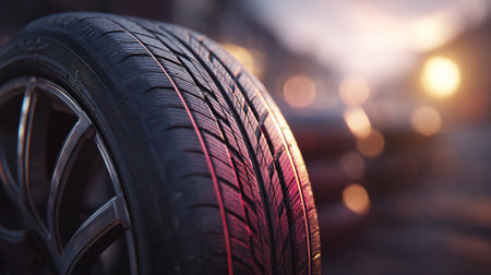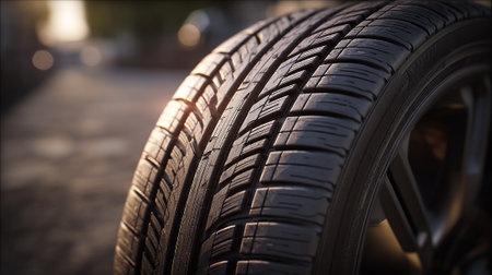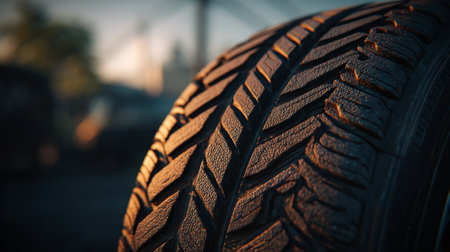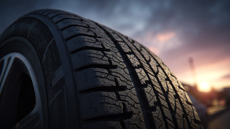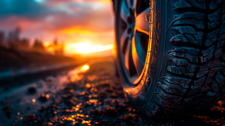 Close-up of a car tire on the road at sunset.