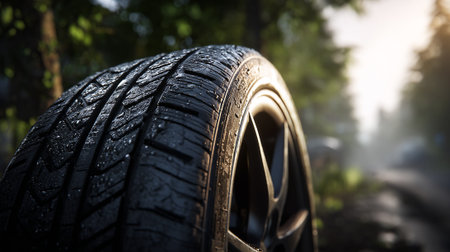 Car tire close-up, selective focus, shallow depth of field
