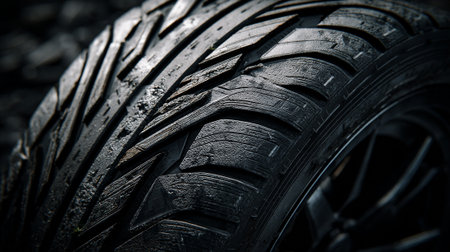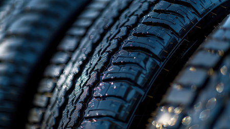This image showcases a detailed close-up of rubber tire treads featuring reflections and water droplets, highlighting texture and design for automotive enthusiasts.