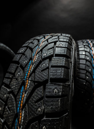 Winter tires with spikes on a black background close-up, safety during winter driving, winter tire protector, winter studded rubbe