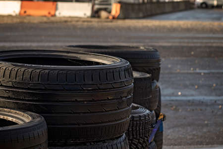 High angle view of stacked tires on a racetrack . Concept of safety in motorsport competitions. Copy space.