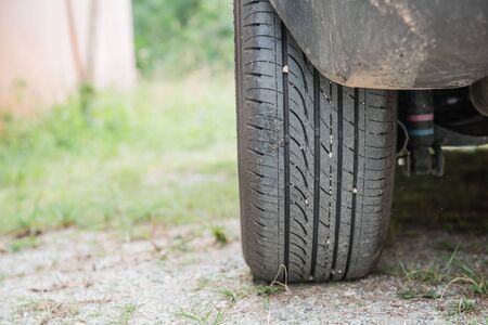 Close up at car wheel tire on gravel, stone street. Back low angle view. Concept safety driving, maintenance.