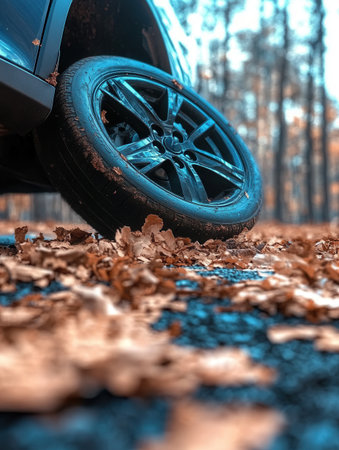 damaged car wheel rim is lying on the asphalt surrounded by a carpet of dry leaves under tall trees that provide a serene autumn backdrop.