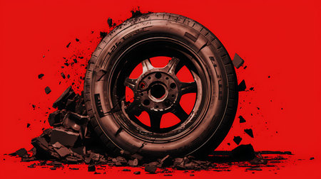 Car wheel with cracked paint on red background. 3D illustration.