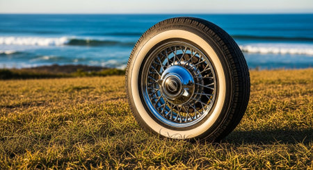 Close-up image of a new car wheel on the ground.