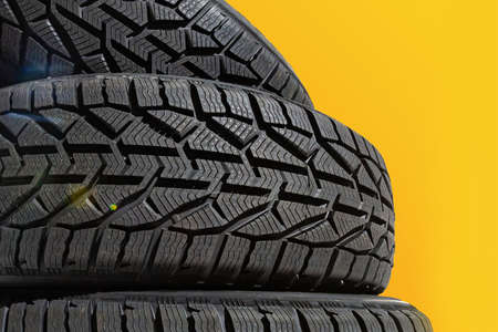 Winter car tires. Group of tires for winter driving on a yellow background.