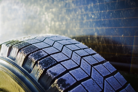 Close-up of a car tire with hoarfrost on it