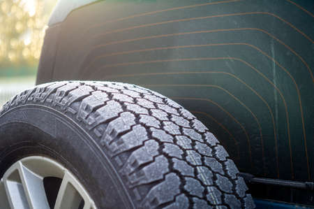 Crystals of the ice on spare tire of off road vehicle, cclose up outdoor shot