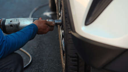 mechanic man using an electric drill to loosen the bolts of vehicle wheel for changing a car tire