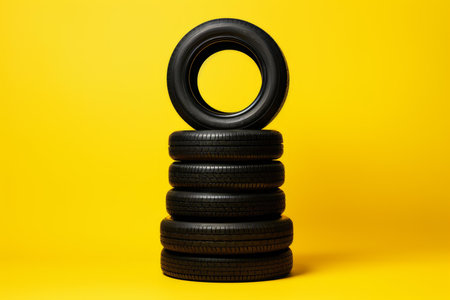 Stack wheel yellow background. Tyre vehicle new. Generate Ai