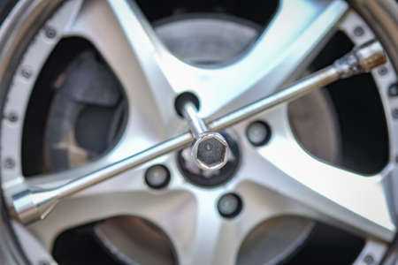Car mechanic screwing or unscrewing car wheel by wrench at car garage in Bucharest, Romania, 2020