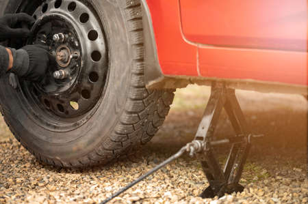 A man twists or unscrews a wheel with a studded tire from a red car standing on a Jack. The concept of puncturing a tire or replacing a summer wheel with a winter one with your own hands
