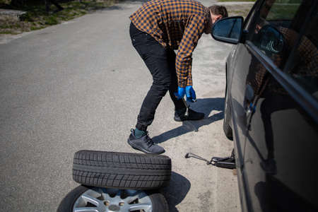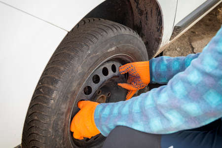The driver changes the wheel of the car. Change summer wheels for winter.