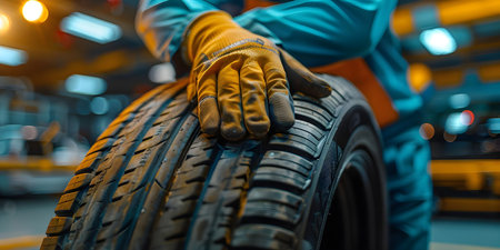 A hand grips a large wrench as it loosens the bolts to remove a tire in an auto repair shop. The focus is on the textured surface of the tire tread and the tool being used.