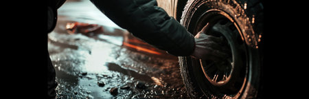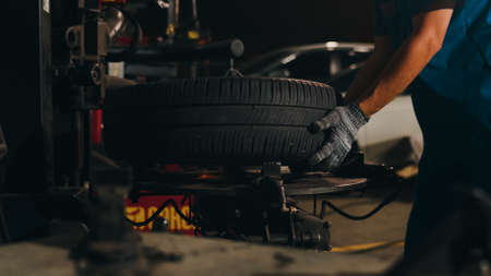 Skilled mechanic conducts tire repair maintenance on vehicle in the garage. Concept Mechanic, Tire Repair, Vehicle Maintenance, Garage, Skilled