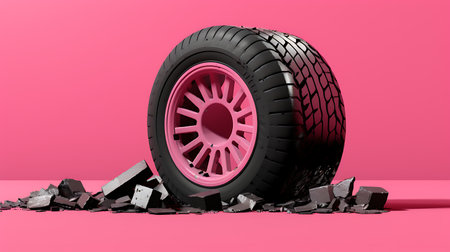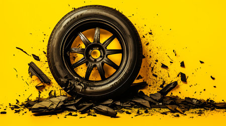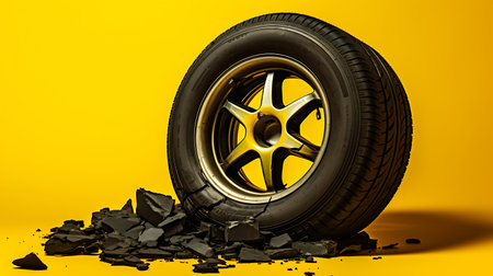 Broken car wheel on a yellow background. The concept of the collapse of the car.