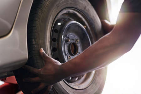 Replacing of damaged flat tyre. Auto mechanic hands holding dirty tyre on the car.Selective focus on hands