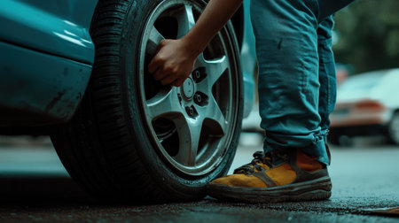 A person demonstrating how to change a flat tire, starting by removing the wheel