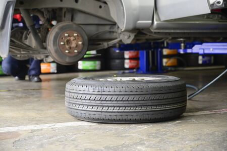 Shallow depth of field (selective focus) image with a mechanic changing the regular summer tyres of a car with winter tyres in a dirty car service.