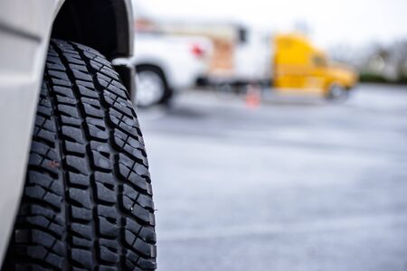Tire tread of the big rig semi truck wheel on the background of another semi truck standing on the truck stop parking lot waiting for continuation of the movement of delivery of cargo on schedule
