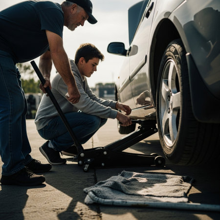 Man instructing young person on safely using a hydraulic jack to change a flat tire.