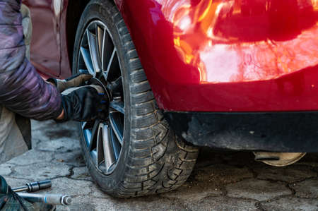 A man twists or unscrews a wheel with a studded tire from a red car standing on a Jack. The concept of puncturing a tire or replacing a summer wheel with a winter one with your own hands