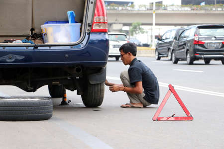 Jakarta, Indonesia May 6, 2019: The man change the tires by himself beside the road at the center of Jakarta.