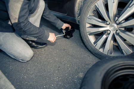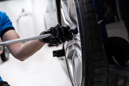 Car service, changing wheel. Man unscrewing car wheel with wrench.