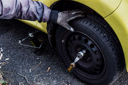 Punched and flat tire on the road. Replacing the wheel with a jack by the driver