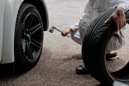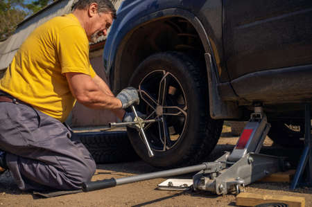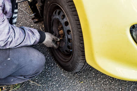 A man changes a wheel on a car, a seasonal change of rubber on a car. High quality photo