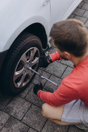 Man changing car tire on roadside using tools, vehicle lifted on jack. Concept of auto repair, maintenance, breakdown assistance and real-life situations