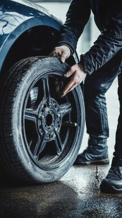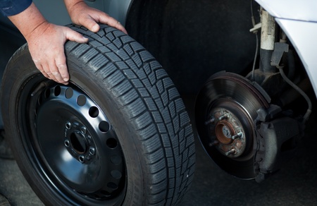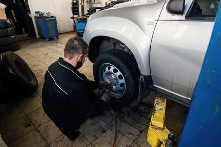 Shallow depth of field (selective focus) image with a mechanic changing the regular summer tyres of a car with winter tyres in a dirty car service.