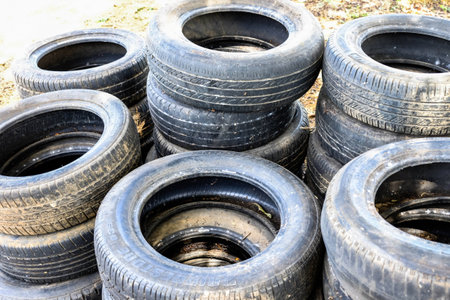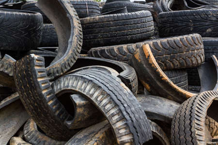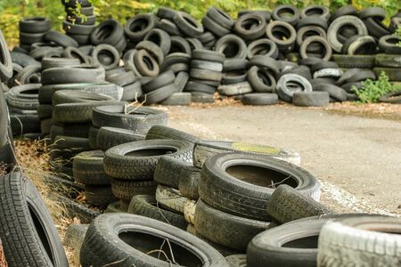 Landfill for recycling worn-out car tires. Stacked old using tires on the ground. Environmental pollution
