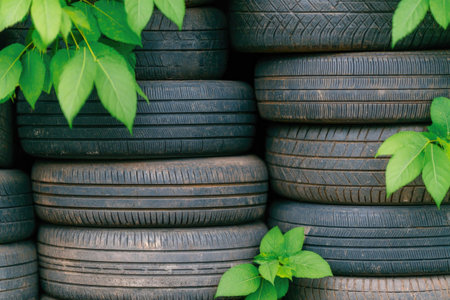 Stack of Old Car Tires with Green Leaves